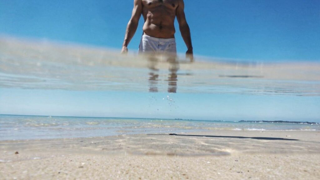 A person appears to float above sand with no lower body. In many cases, a shallow sheet of clear water reflects the bright sky, while the person’s legs are submerged and visually erased by glare. These are unsettling photos explained by reflections, polarization-like glare effects, and the way blown highlights hide edges.